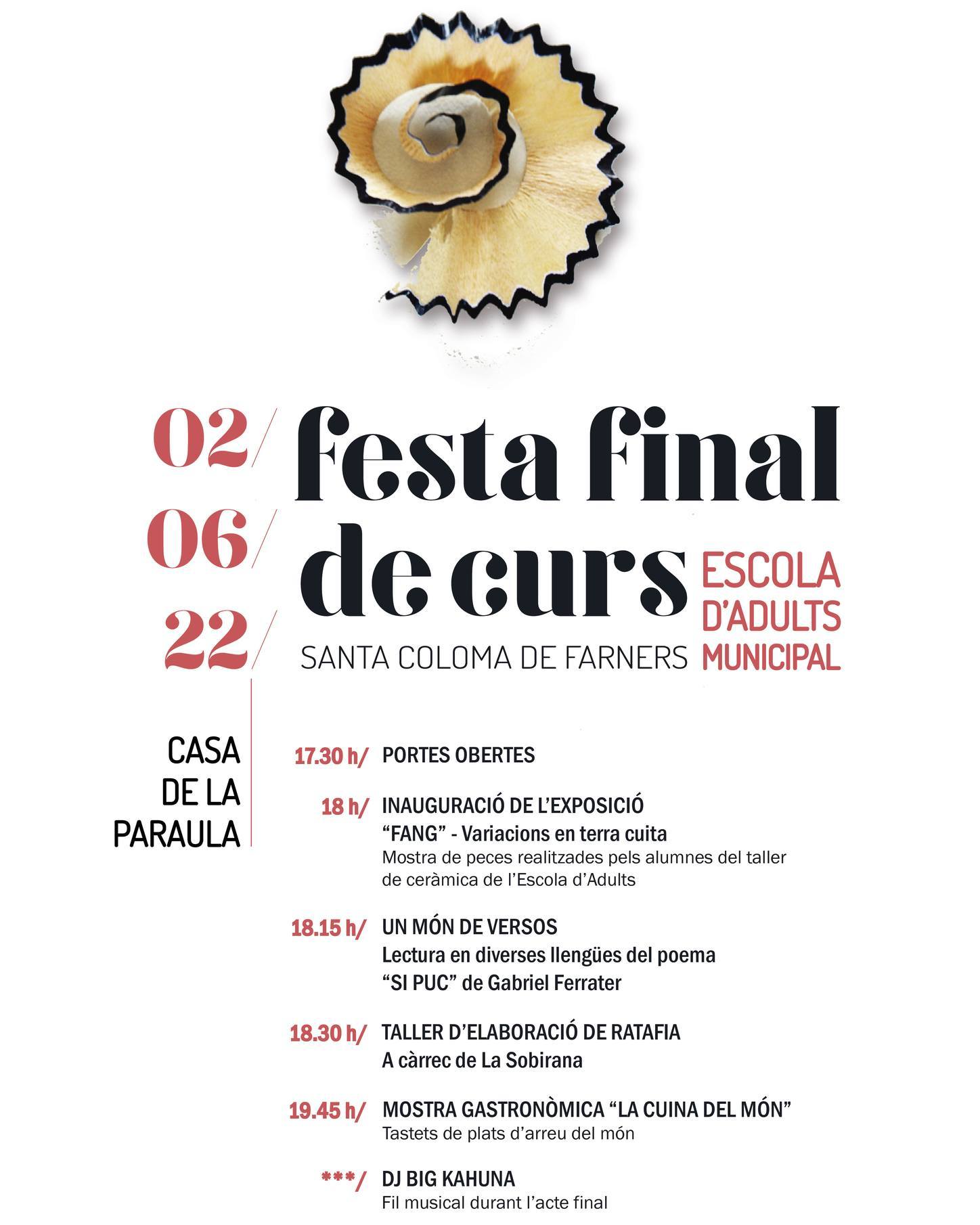 Coincidint amb l'acte, tindrà lloc la festa final de curs de l'Escola d'Adults Municipal, i per l'ocasió s'ha programat activitats ben diverses com una lectura en diverses llengües de poemes de Gabriel Ferrater, un taller d'elaboració de ratafia, a càrrec de La Sobirana, una mostra gastronòmica de "La cuina del món", on es podran tastar plats d'arreu del món i una sessió del Dj Big Kahuna.