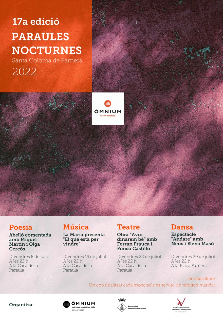 Els divendres d’aquest mes juliol se celebrarà una nova edició del festival ‘Paraules Nocturnes’, coorganitzat per Òmnium Selva Interior, l’Ajuntament de Santa Coloma de Farners i la Càtedra de Poesia Contemporània Joan Vinyoli.