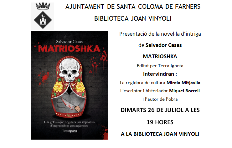 Salvador Casas Busquets (Santa Coloma de Farners, 1953) presentarà la seva última novel·la, Matrioshka. Escriptor de ficció. El seu gènere preferit és la novel·la negra. Ha guanyat el premi del Col·legi d’advocats de Mataró amb Temps difunt (2006). Ha publicat, també, L’impostor accidental (Columna, 2007), i Samba per a un difunt (Gregal, 2017). Va quedar finalista del IV premi Memorial Agustí Vehí – Vila de Tiana amb Un cadàver inquiet (Crims.cat, 2018). Narrativa curta: Negra és la nit, premi del jurat del IV concurs de relats El vi fa sang 2018, i Una mort merescuda, premi del VI concurs de relats criminals Planeta Lletra 2020. Pertany al grup literari Verum Fictio.