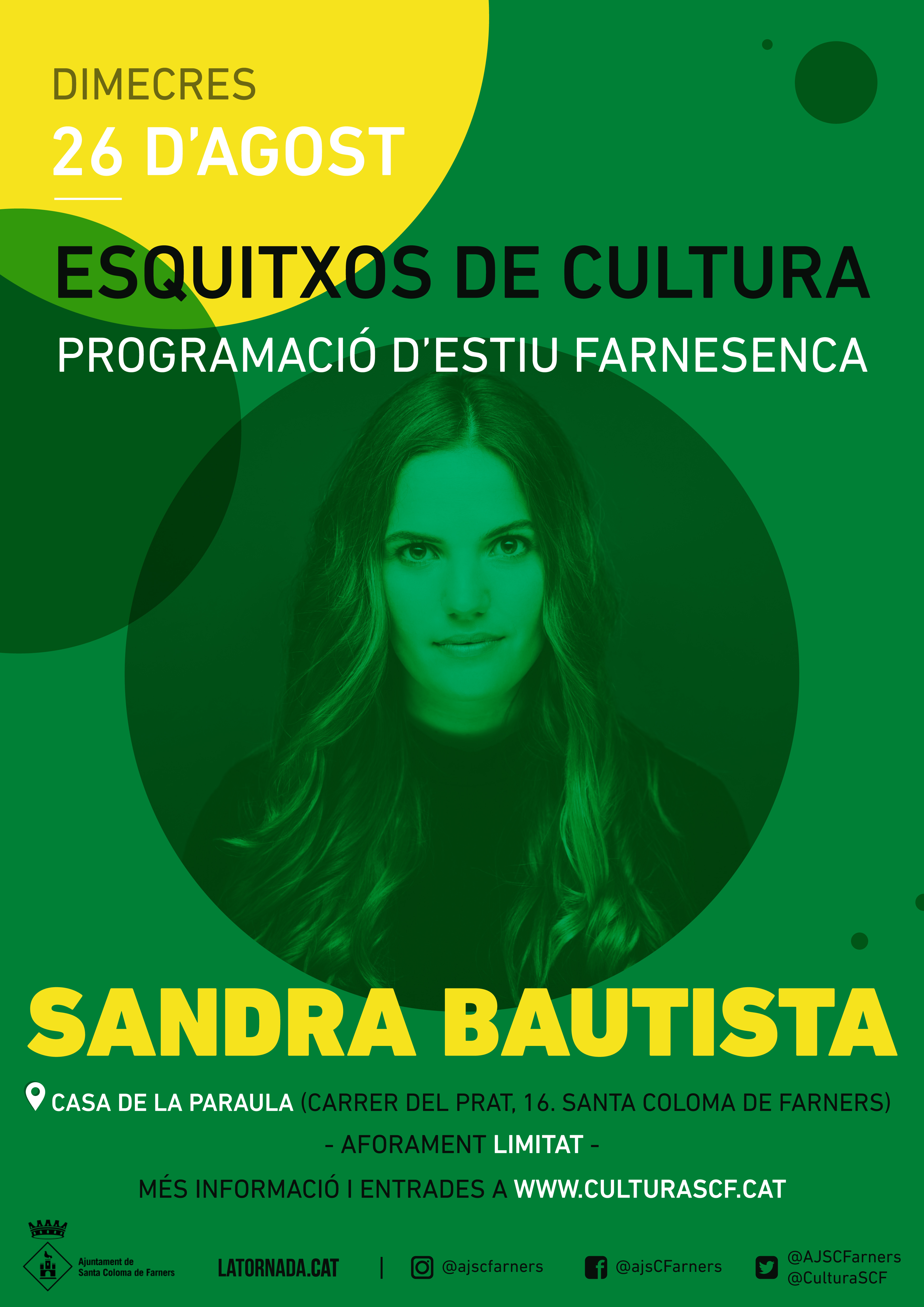 Sandra Bautista és una de les perles de la pedrera musical catalana. Talent, joventut i una veu dolça i incisiva. Guanyadora de la darrera edició del Sona 9, el proper 27 de setembre treurà a la llum el seu nou treball discogràfic Trapezista un disc molt esperat que vindrà carregat de sorpreses!
