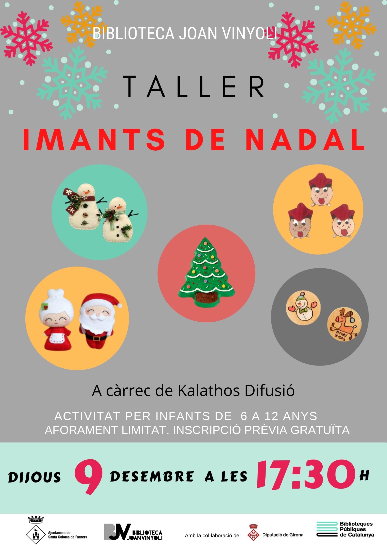 El taller consisteix en acolorir, retallar i enganxar diferents elements en un disseny original, per formar un personatge de Nadal que finalment anirà unit a un imant.