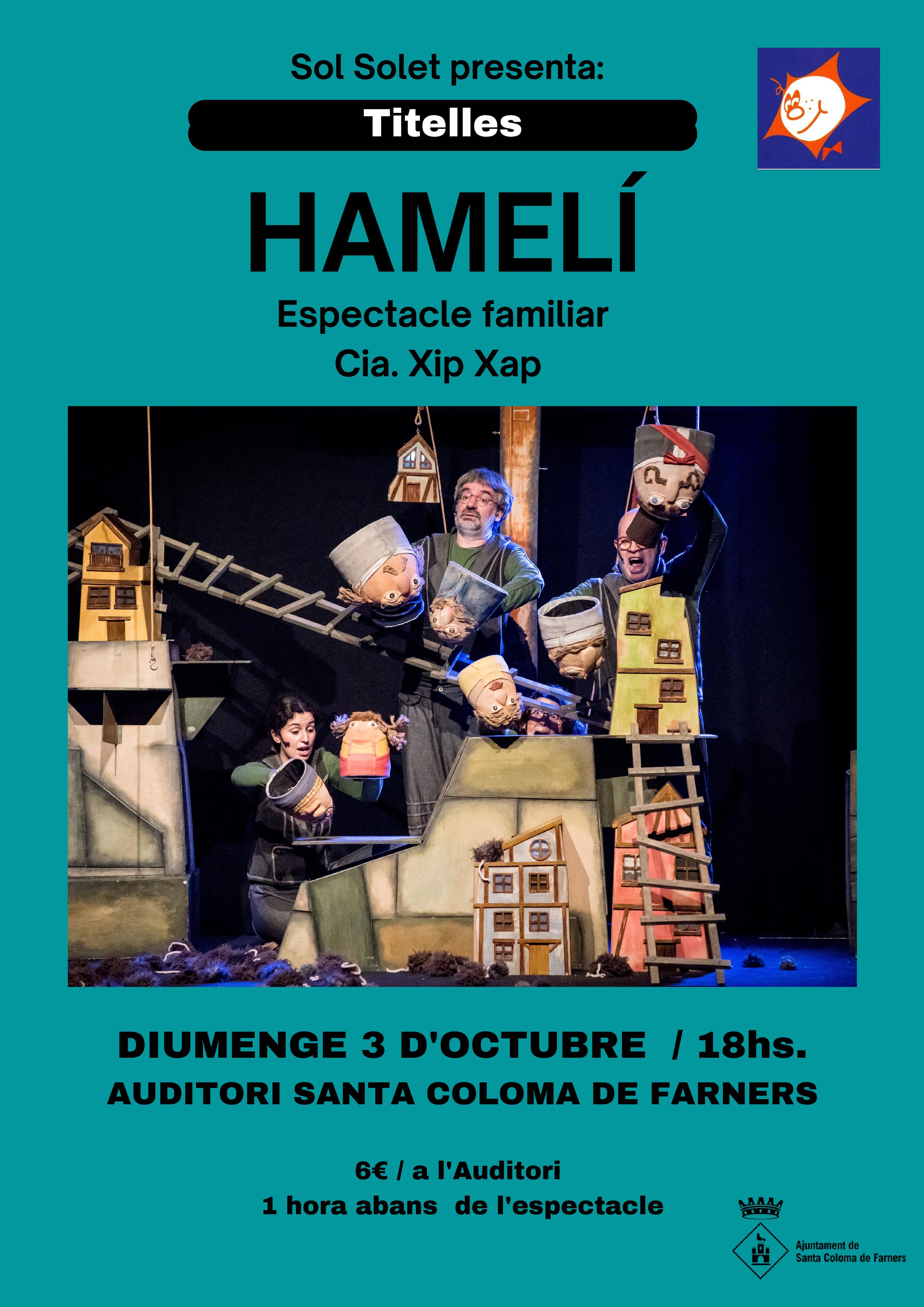 Alguns clàssics tenen el poder de sobreviure al pas del temps i continuar oferint lectures que ens resulten completament contemporànies. Com HAMELÍ, un espectacle basant en un conte clàssic que manté viva una essència que pensem que és imprescindible explicar. HAMELÍ explica la misteriosa desgràcia d'una vila que ben bé podria ser la teva, on conviuen tots els veïns i veïnes, amb les seves alegries i les seves discòrdies, però un fet farà que la seva convivència es vegi alterada de forma dramàtica, la població és envaïda per una plaga de rates, però ningú sap d'on han vingut, o potser no han vingut d'enlloc? I sempre han estat allí?