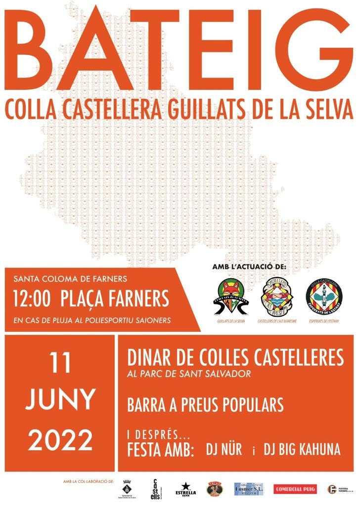 Aquest dissabte 11 de juny (12 h), a la plaça Farners, tindrà lloc el bateig oficial de la nova colla castellera de la comarca, Guillats de la Selva, amb seu a Santa Coloma de Farners. L’acte s’havia de celebrar a finals de març de 2020, però l’inici de la pandèmia ho va impedir. Dos anys més tard la colla ha tornat a assajar i es troba a punt per la construcció de castells. Aquest dissabte, els Guillats de la Selva estaran apadrinats pels Esperxats del Pla de l'Estany i els Maduixots del Maresme, que també participaran a l'acte amb diferents castells i pilars.