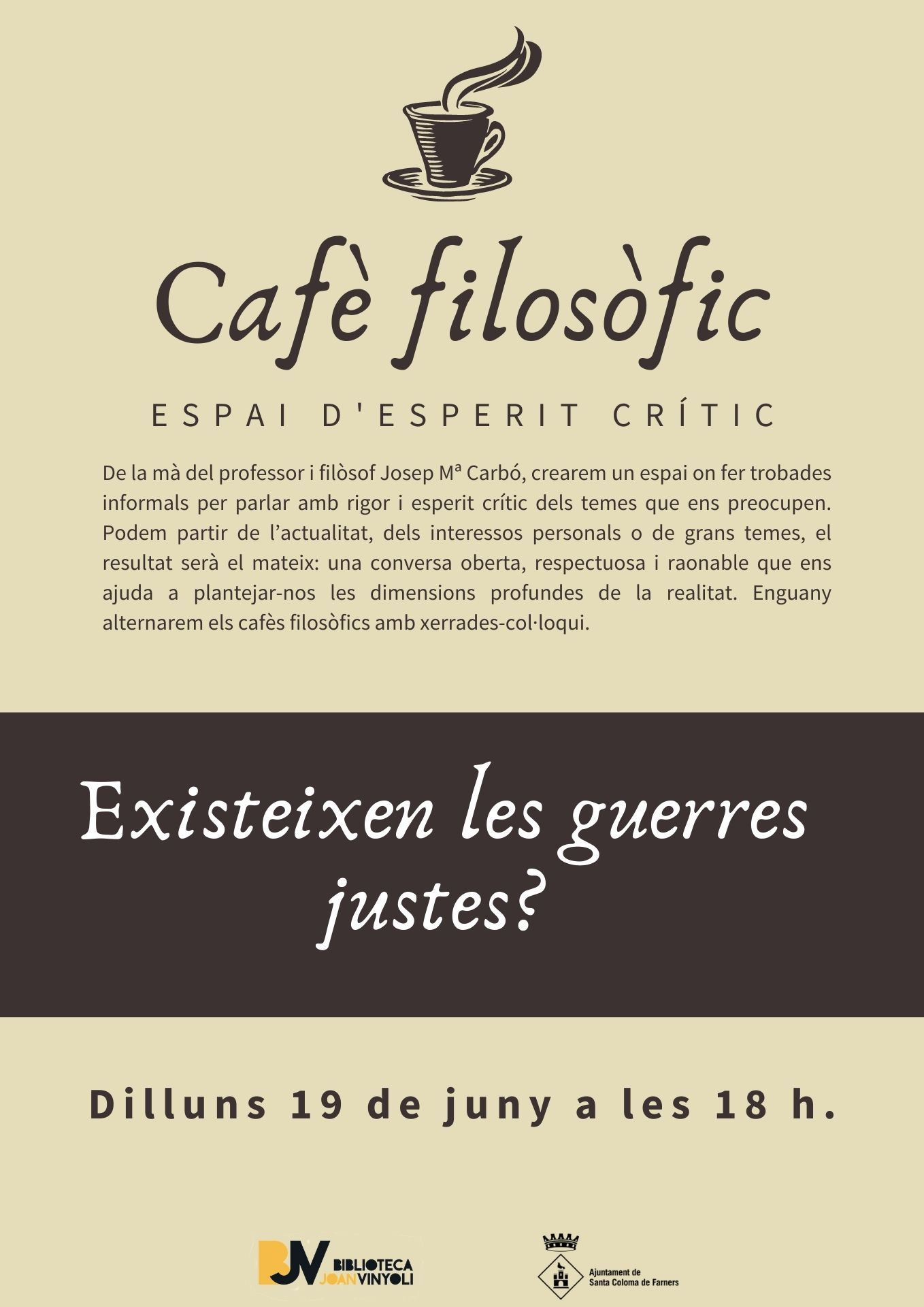 De la mà del professor i filòsof Josep Mª Carbó, crearem un espai on fer trobades informals per parlar amb rigor i esperit crític dels temes que ens preocupen. Podem partir de l’actualitat, dels interessos personals o de grans temes, el resultat serà el mateix: una conversa oberta, respectuosa i raonable que ens ajuda a plantejar-nos les dimensions profundes de la realitat. Enguany alternarem els cafès filosòfics amb xerrades-col·loqui.