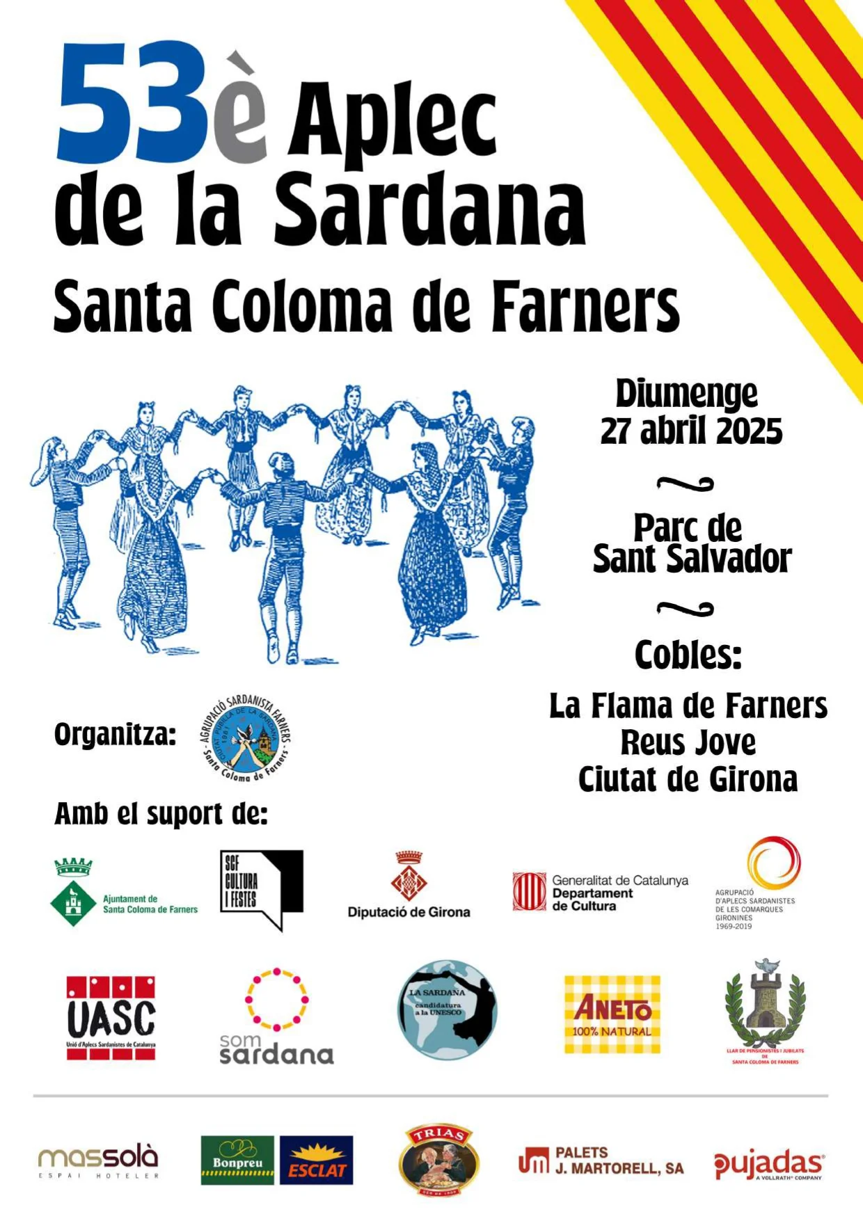 El diumenge 27 d'abril, torna a Santa Coloma de Farners, l'Aplec de la Sardana. En la seva 53ena edició, organitzada per l'Agrupació Sardanista Farners, i que es realitzarà al Parc de Sant Salvador, hi comptarem amb les cobles següents: La Flama de Farners, Reus Jove i Ciutat de Girona.